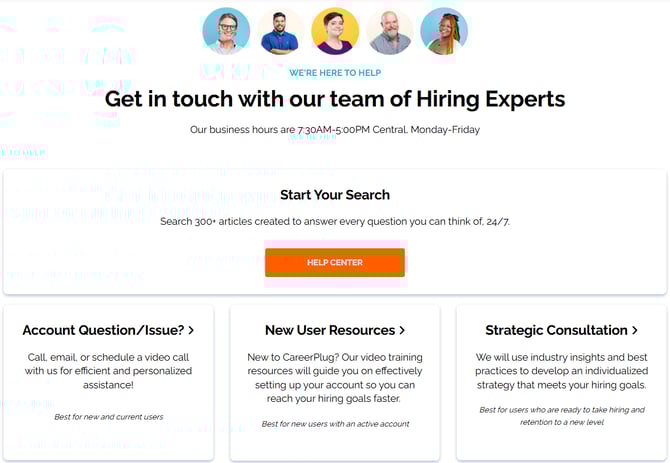 CareerPlug’s Hiring Expert Team is available Monday through Friday, 7:30 a.m. - 5 p.m. Central Time, excluding holidays.
